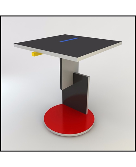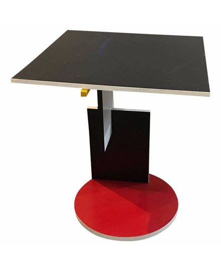 Gerrit Rietveld was a De Stijl (Neoplasticism) master. He pursued living comfort through simple structures and harmony scales with horizontal and vertical lines and large colored parts. The product is designed for Utrech's Schroder House and consists of a top blue square and red round base, which is an open form.